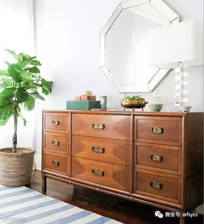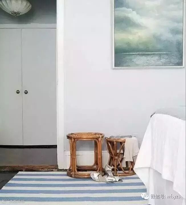 主卧空间依然让人惊艳。无论是用麻绳包裹的床头板,还是绿色复古的床头柜,或者是箭头造型的台灯,都给人清新又别致的味道;床尾的八角形镜面和复古梳妆柜也十分耐看,蓝白条纹的地毯和蓝色墙面设计,让卧眠氛围更显静谧和舒适。