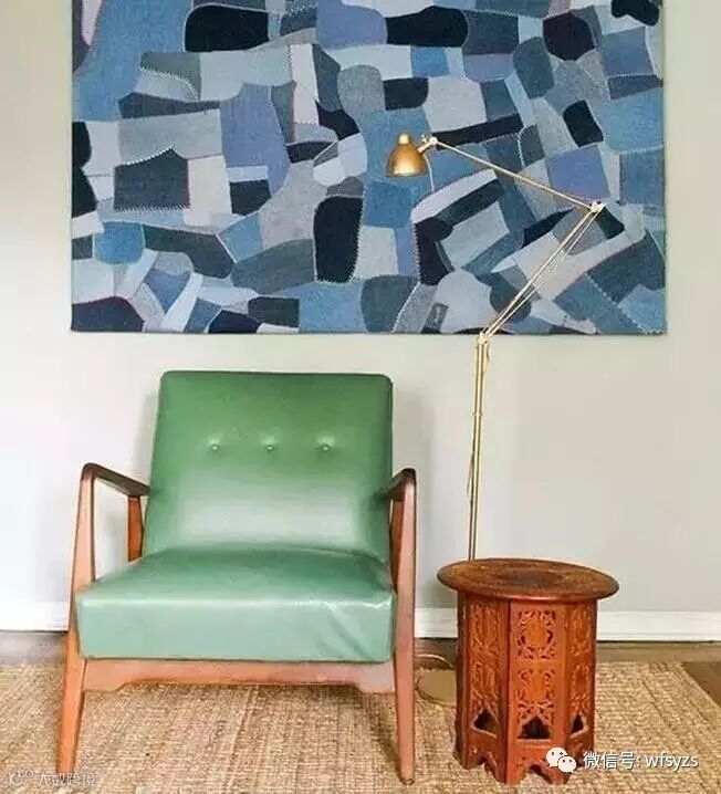复古皮质的懒人沙发,让主人在家更能随心所欲;造型看似简单的茶几细看十分精致,和民族印花的地毯很相称;绿色的沙发椅后方挂着一副蓝色调的抽象几何画作,给空间注入一丝活力。
