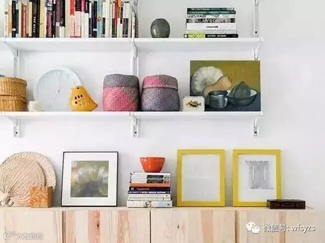 书柜以浅色木质柜体和白色层板构成,上方整齐的摆满着色彩缤纷的书籍、图画和摆件,各种精致的小物件,让人看着就爱不释手