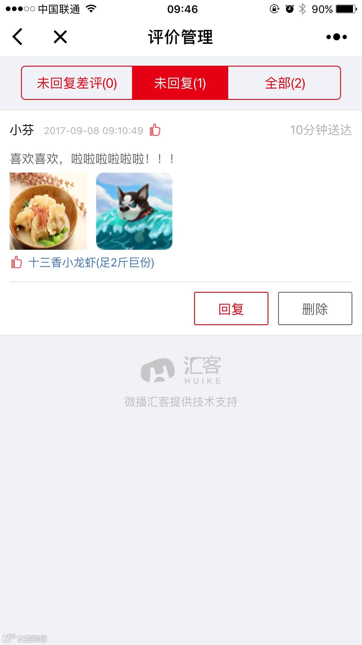 商家可在汇客小程序管理端查看所有用户点评以及评分状态,并可对用户评论进行快速回复。