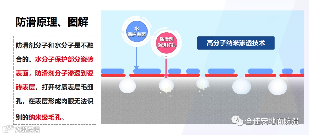 全佳安石墨烯防滑液是水性溶液,无色无毒无残留、无腐蚀性、处理完地面无异味。采用新的高分子纳米渗透技术,能有效地渗入地砖、瓷砖、花岗岩的毛细孔内,溶解少量的硅,使原毛细孔变粗,在表面形成很多细小看不见的纳米级的凹痕。