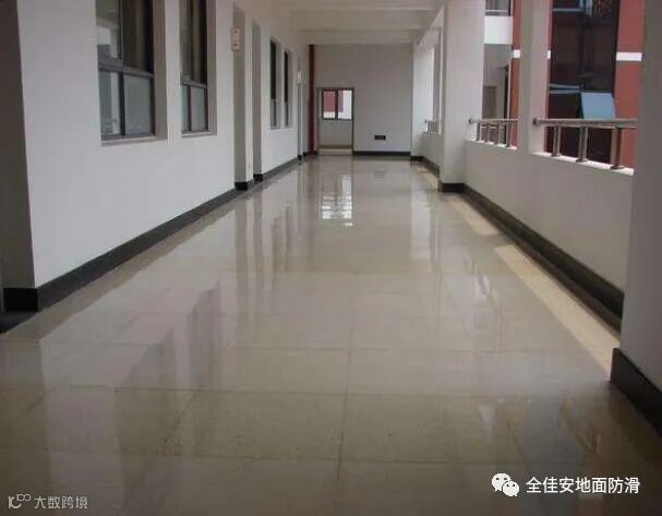 学校在装修时,大面积使用的是瓷砖,而且所选用的瓷砖一般多是抛光易清洁的瓷砖,由于这类瓷砖遇水比较易滑,而学校的教学楼、办公区、走廊、食堂等面积大,需要经常用水洗,这些区域很多又是露天或者是本身就是涉水的区域,地面经常处于湿滑状态。