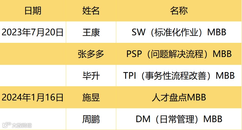 1月16日,在公司2023年年度经营会上,董事长徐总给新认证的两名MBB人员颁奖,生产主管周鹏获得了“DM(日常管理)MBB”认证,人资主管施昱获得了”人才盘点MBB“认证,在此向他们表示热烈祝贺,并对他们的付出表示衷心感谢。