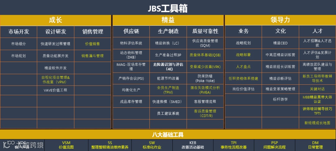 JBS系统由“成长”、“领导力”、“精益”三个模块以及基础工具组成,每个模块包含一系列的工具方法。JBS帮助我们聚焦战略规划、跟进绩效指标、挖掘现场浪费,从而解决问题、创造价值、并对员工赋能。今天,JBS帮助我们持续保持竞争优势。