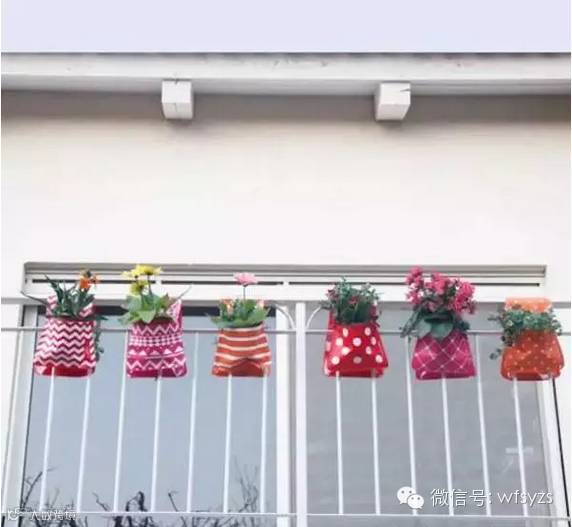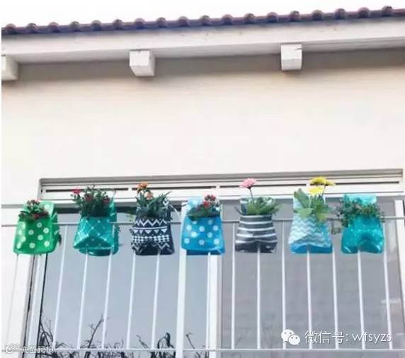 节省宝贵的地面空间,用花袋替代一堆花盆,试着从栏杆摆放它们,各种各样的颜色和图案袋子冒出鲜艳的小花,营造出来的效果不比盆栽差。