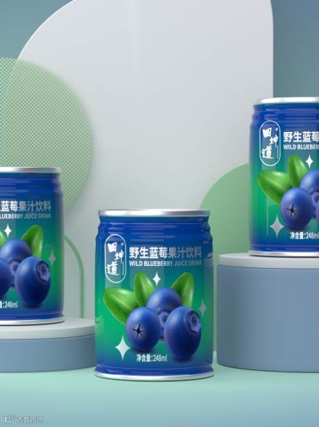 田坤道野生蓝莓果汁在包装的设计上有三缩颈易拉罐与保龄球玻璃瓶两种款式,易取易开,营养锁鲜。