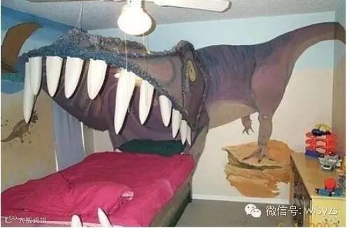 胆小者勿入的卧室!现在3D电影流行起来了,跟着许多的游乐场以及娱乐场所都开始运用3D画作的墙壁。而这间卧室则是运用了3D的恐龙,想必主人一定非常的热爱恐龙,不然这么一眼看上去就让人觉得凶猛的卧室,一定会在夜里睡不着觉的。但是只要喜欢就拿来装饰的洒脱,也反映出了主人的胆大之处。