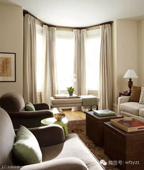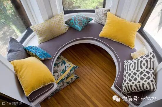 转角的飘窗设计,顺应了窗户的造型形成半圆形休息区,明亮的自然光线让窗外美景尽收眼底,亮色的布艺软装显得十足温馨与舒适 。
