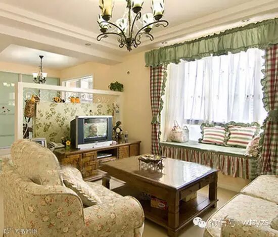 田园风的飘窗设计与整体的家装风格保持一致,想要休息的时候可以把两边的布艺帘子放下来就成了一处宁静的养身地儿了,别致的飘窗设计令人惊羡。