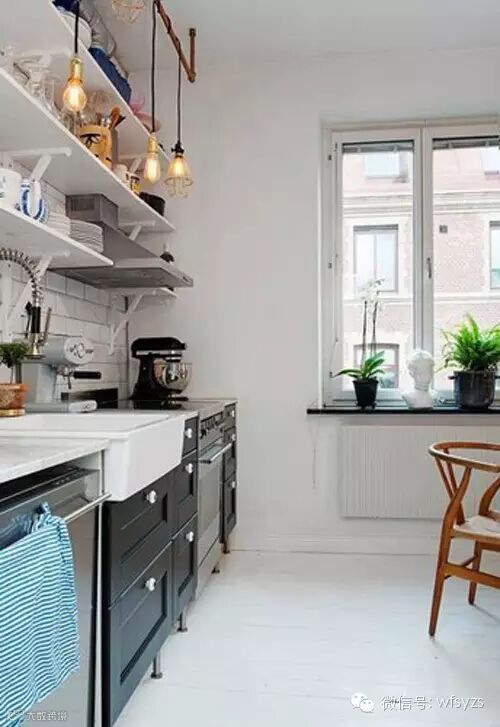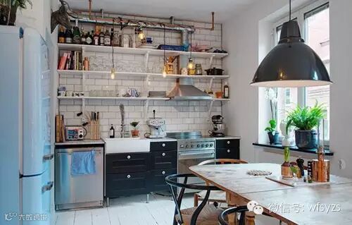 小编的话:白色砖墙上,三层简约搁架的设计可以供屋主在这边收纳不少厨房用具,隔板架向来都是家装中较为实用的设计,这款厨房设计也不例外。