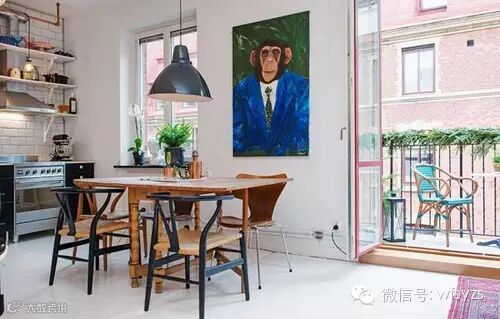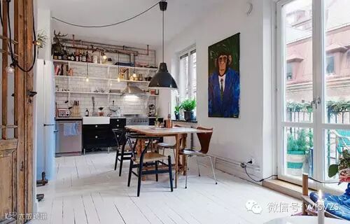 小编的话:餐厅被房主设置在厨房空间之中,木色餐桌在整个浅色系空间中显得自然,顶部的黑色简约吊灯能够给到这一区域适度的照明,在用餐区一旁的墙面上以一幅动物形象的装饰画来装饰墙面,让这个空间中显现出活跃有趣的氛围。