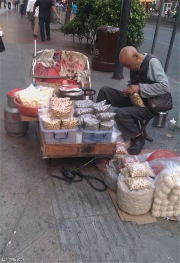 有一位80岁左右的老人在摆摊, 用颤抖的双手为客人包装煮好的花生和瓜子,我不爱吃瓜子,当我拿起两包瓜子的时候,老人用含糊不清的话笑着给我换了一包,说,这包比较满,要这包吧。