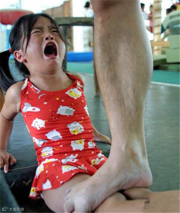 一名年仅4岁的小女孩被父母送到南宁市体育馆业余体校学习体操,教练为帮助她练好柔功,用脚给她辅助训练,小女孩非常害怕,大哭了起来。