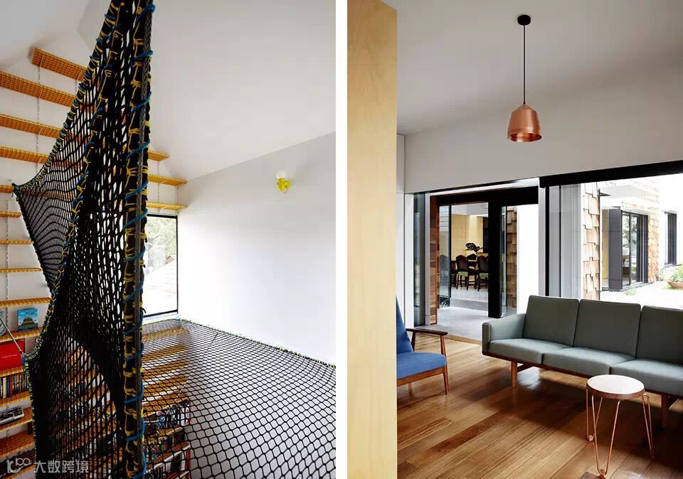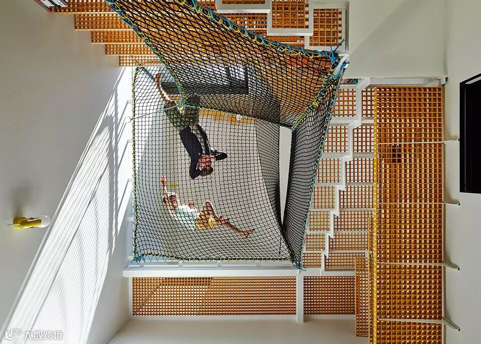 男孩的图书馆—— 给男孩准备的图书馆主要垂直发展,整个墙面都满满的装上书,空中挂上休息网供孩子攀爬,玩乐,同时业主也期待自己的孩子可以在这里阅读,思考。