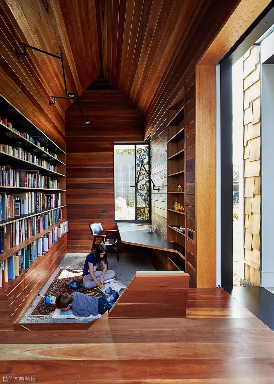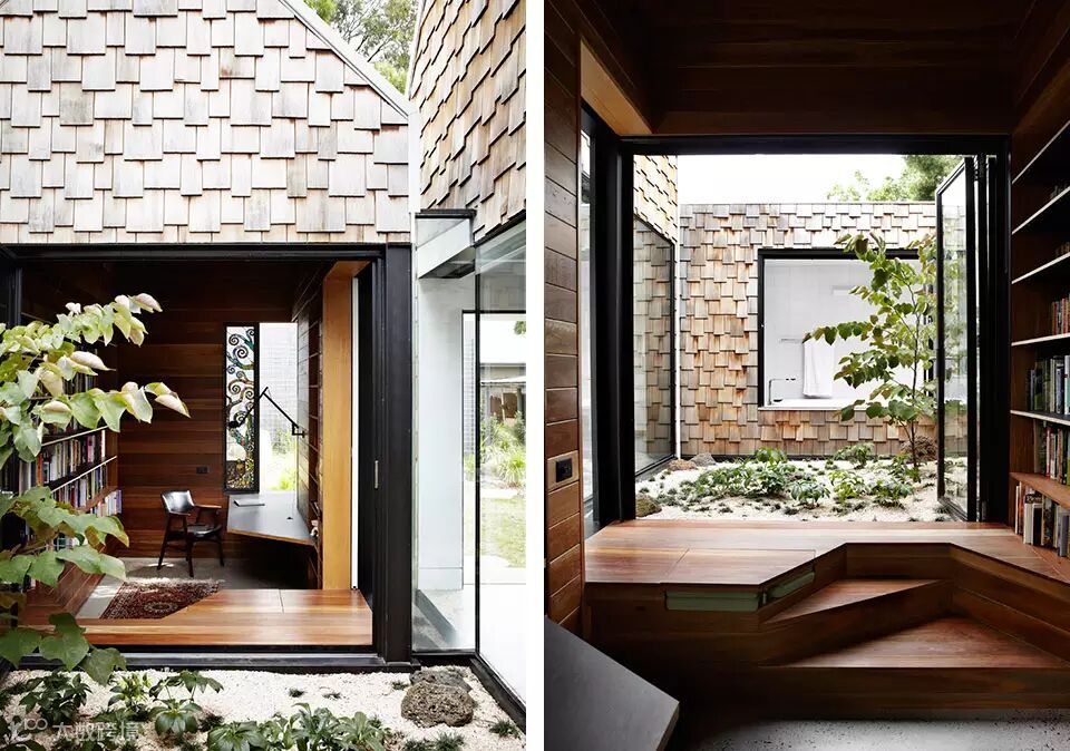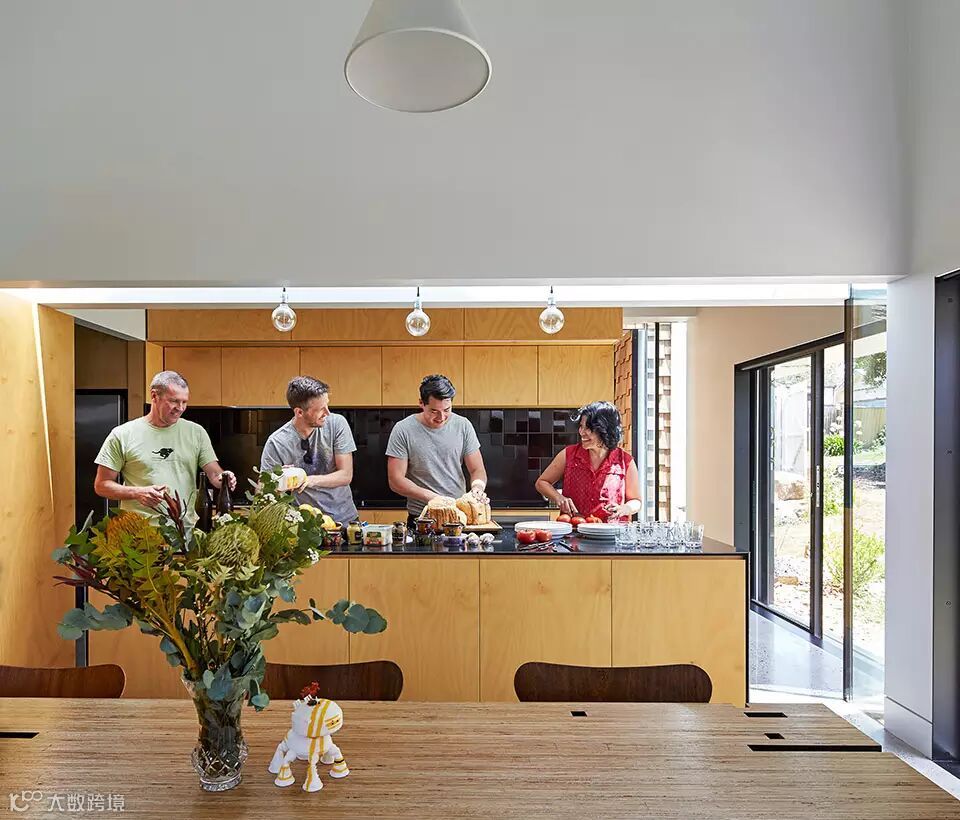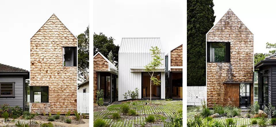 “村庄”位于澳大利亚维多利亚州的爱范顿,场地原有一栋老建筑。建筑师把老建筑改建成为两个孩子的卧室和全家人的客厅,然后再新增的几个建筑体量内设置了厨房,餐厅,主卧,卫生间,图书馆,游乐屋。在这样的环境中,生活不再限定在厨房,浴室等场所中,生活的眼光放在了艺术,政治,宇宙等等事物之上。