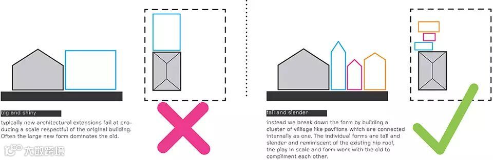 在很多改建案例中,新增的建筑就像是一个陌生的癌细胞依附在原有建筑上。而在这个改建项目中,一系列小结构围绕老建筑布局形成独有层次,内中有外,外中有内的结构。整个街区3号门牌过了就是7号门牌,遗失的5号门牌被“村落”“代替”。另外建筑师还考虑了第五立面,让整个区域从空中看起来也非常美观。