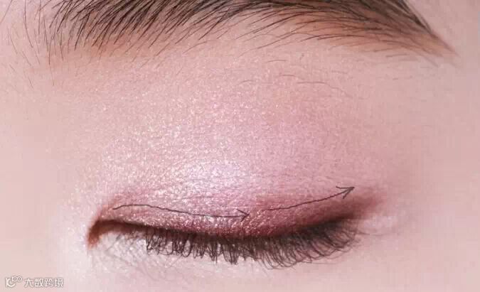 STEP3:粉紫色的眼影在双眼皮范围内晕染,眼球中央用浅粉色打亮。