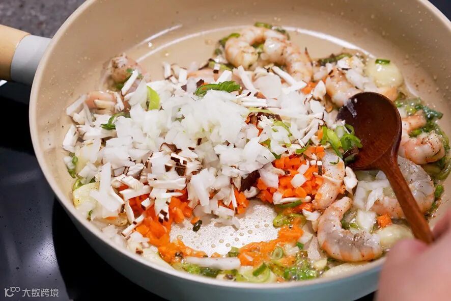 田坤道五常稻香米 1碗、鲜虾 10只、蒜瓣 3个、洋葱 1/3颗、大葱 1/2根、蘑菇 1个、胡萝卜 1/5个