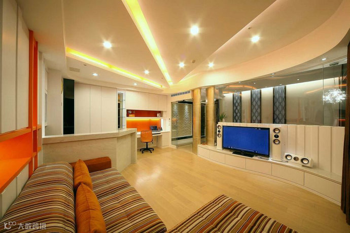 弧形的柱体、电视柜,衬以橘、白色系营造放松感。