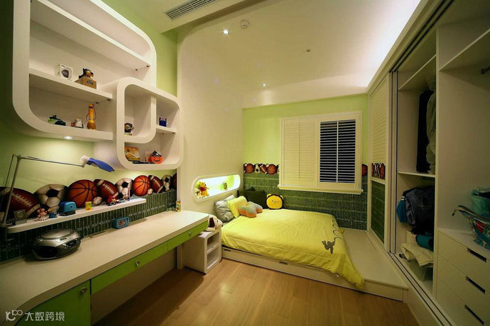 球类为主题的绿色系男孩房,调和出空间活泼度。
