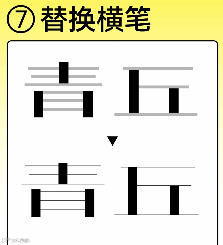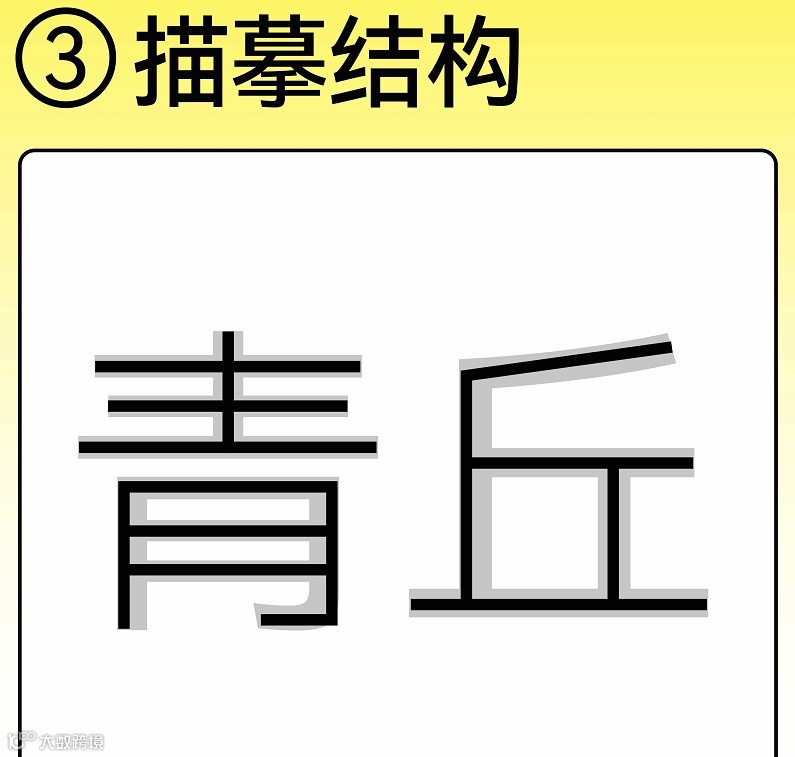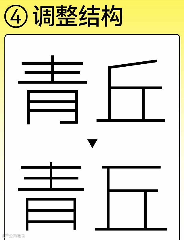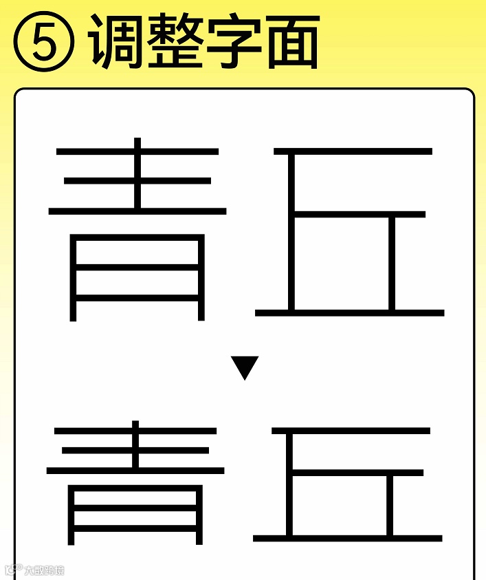 因为我们目的是做Logotype(字标),所以可以考虑进一步图形化字体。首先我去掉了「青」字下面的钩,再将「丘」字最上面笔画处理成平的。调整笔画的同时要注意微调结构。因为你调整笔画的时候,是会对结构产生一些影响的。