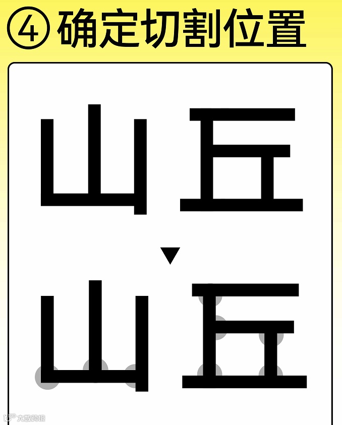 首先选择一款字体作为打底字,用来参考结构。接下来描摹它的结构,在这个过程里需要稍作微调,并且观察哪里适合进行切割。通常在横竖笔画交叉处切割会更合适,但要注意避免切割太多部分,控制不好会显得散乱。