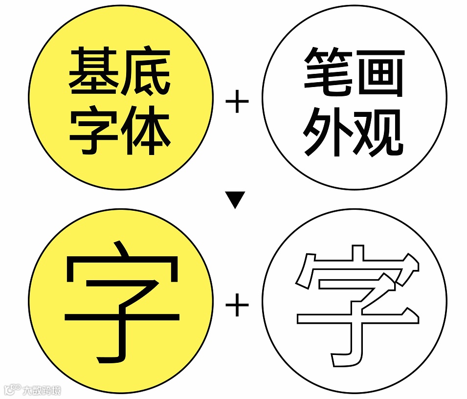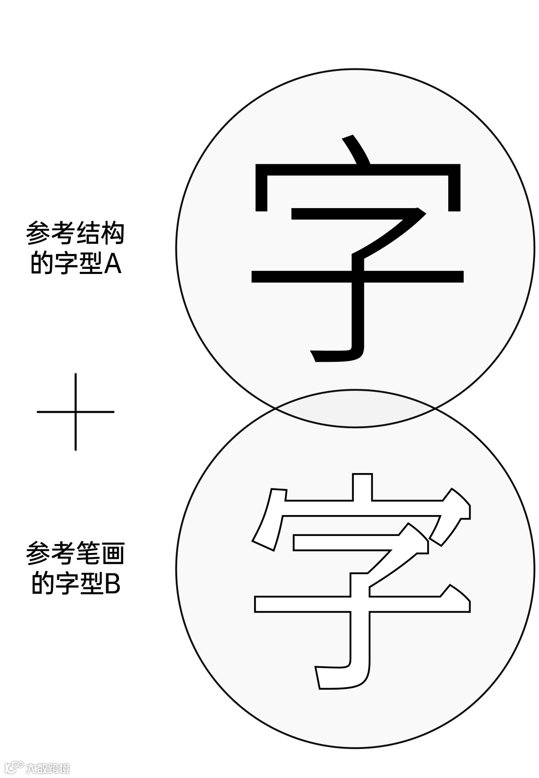 让我们再来温故一下这次方法的核心:用参考结构的基底字型A来结合参考笔画外观的字型B,从而产生新的字型。这个方法的好处在于,不需要你有深厚的字体设计功底,就能做出比较稳定的字型出来。