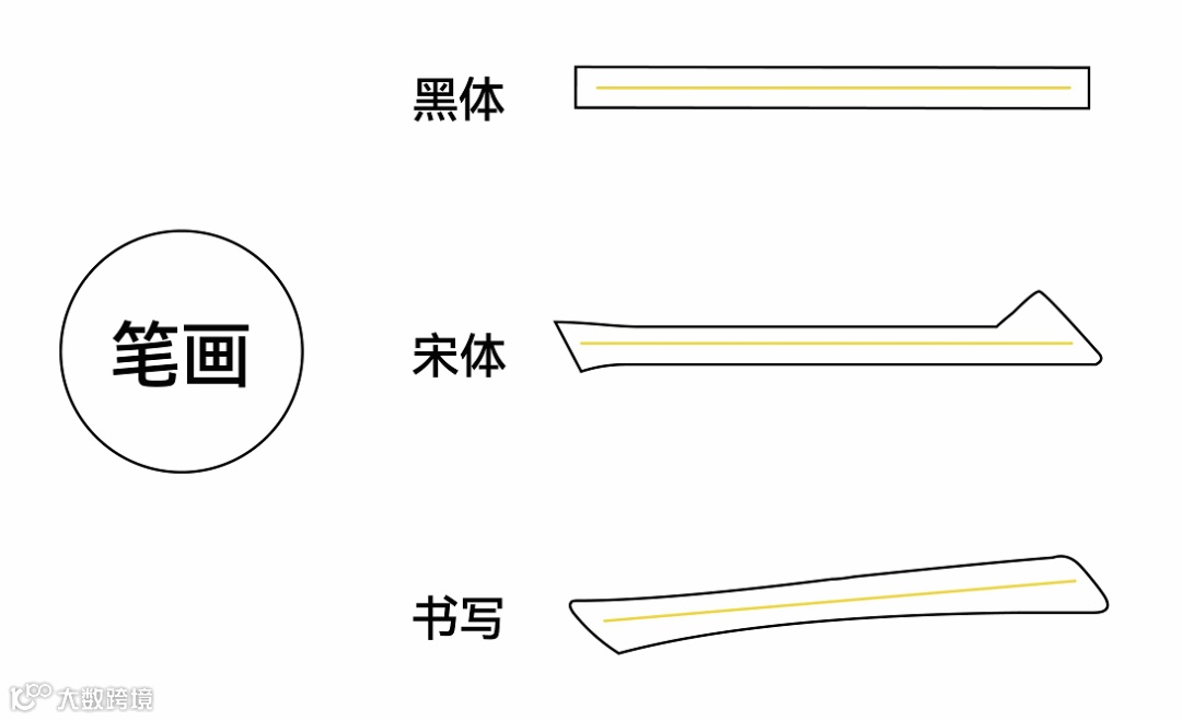 这里我们说的笔画,是指字体设计里面的「体饰」。如上图所示,同样的一横笔,会因外在笔画的变化而给人不同感受。黑体没有什么明显的装饰;宋体在收笔处有衬角;书写的笔画有粗细变化。当然,这只是一部分字体的笔画特征,字体的种类还有很多。