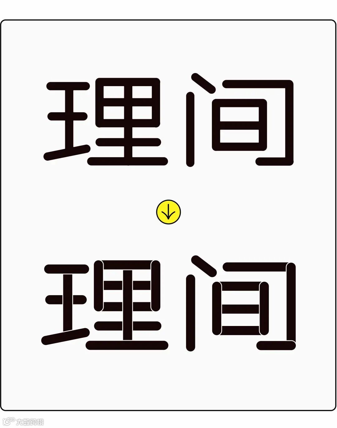 再看这个案例,先把所有向外突出的角变得圆润一些。这一步的变化已经让字型有了一些温润的感觉,不过,笔画交错所形成的内角仍然是比较尖锐的,也需要统一变圆。