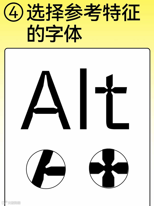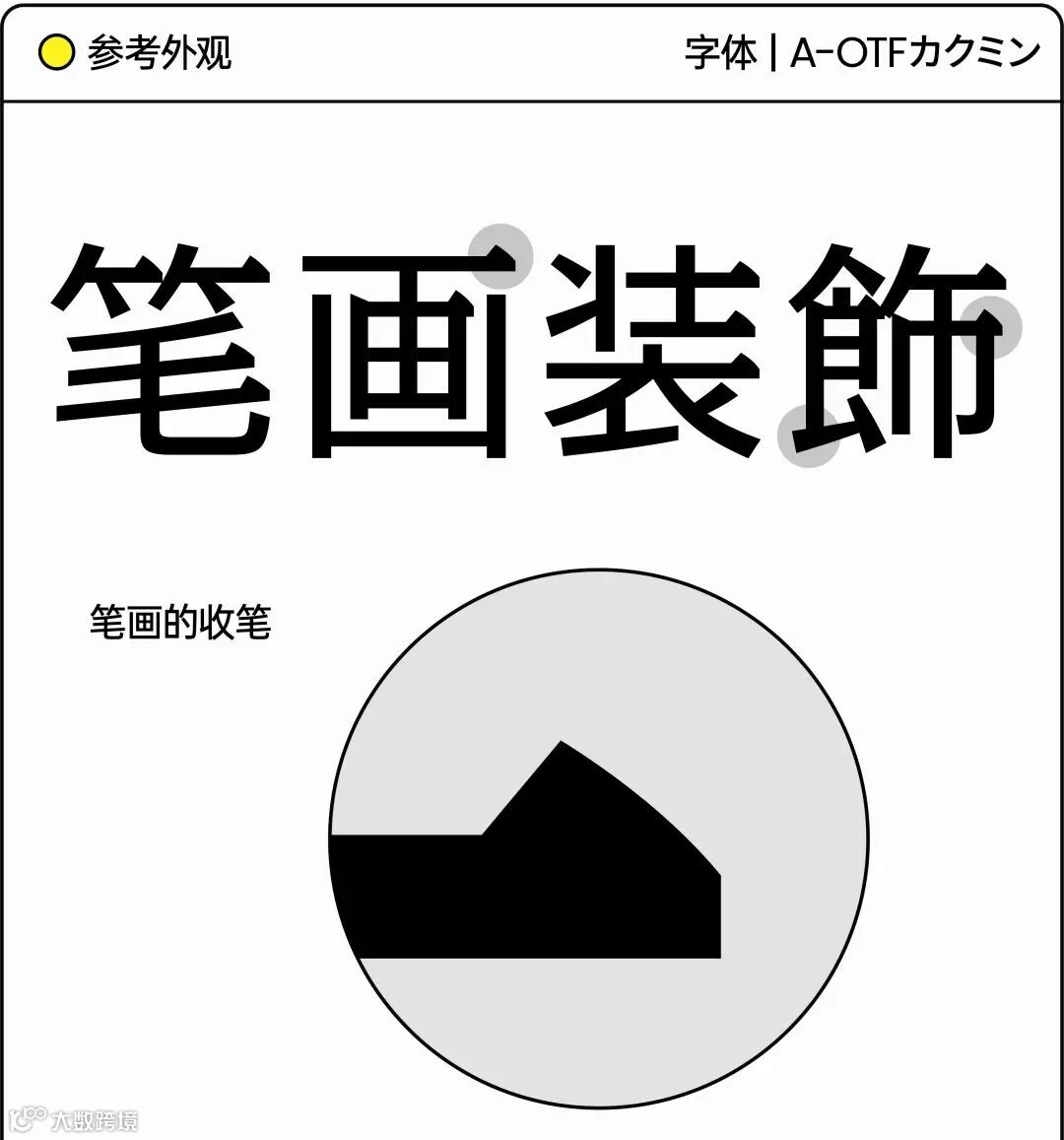 观察它的笔画可以发现都添加了一个锐角三角形,简洁又不乏特点。我们也可以在基础的字体上添加类似这样的特征,这就是所谓的参考笔画装饰。