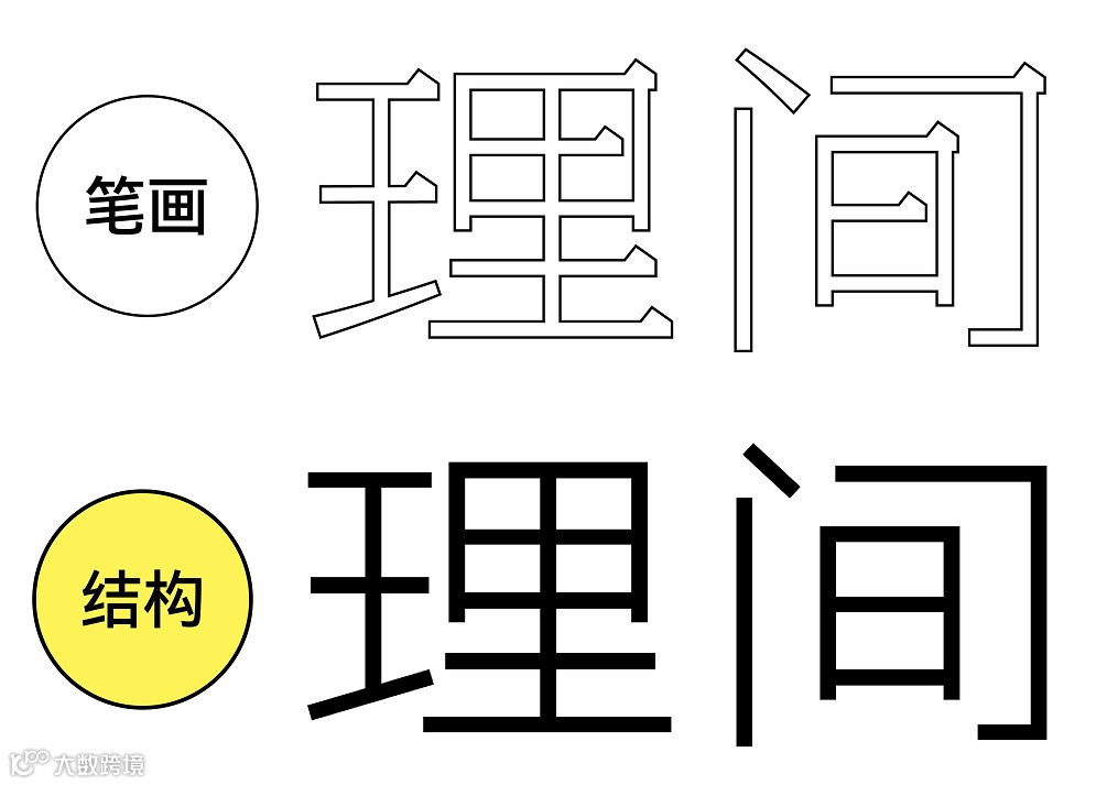那结构是什么呢?以「东」字为例,中间的黑线就是它的结构,相当于人的骨骼;外面灰色的字体相当于人的皮肤、五官。字体是由内在的“骨骼”和外在的“五官”共同形成的。