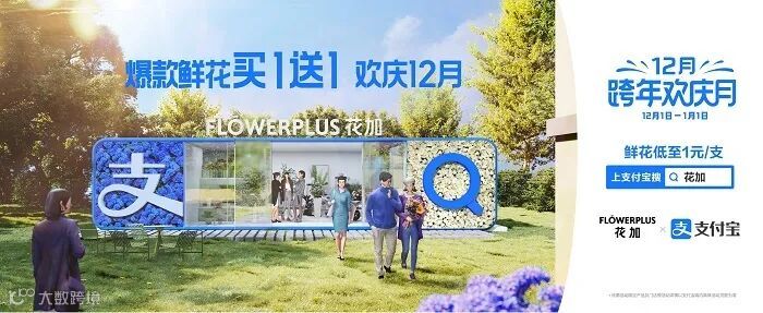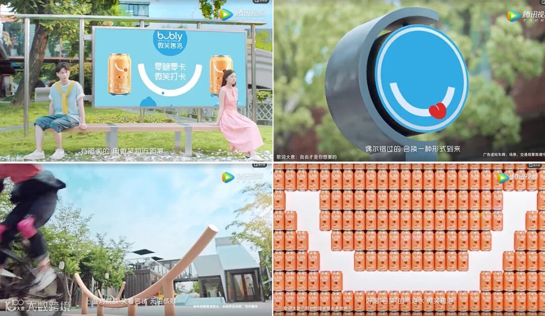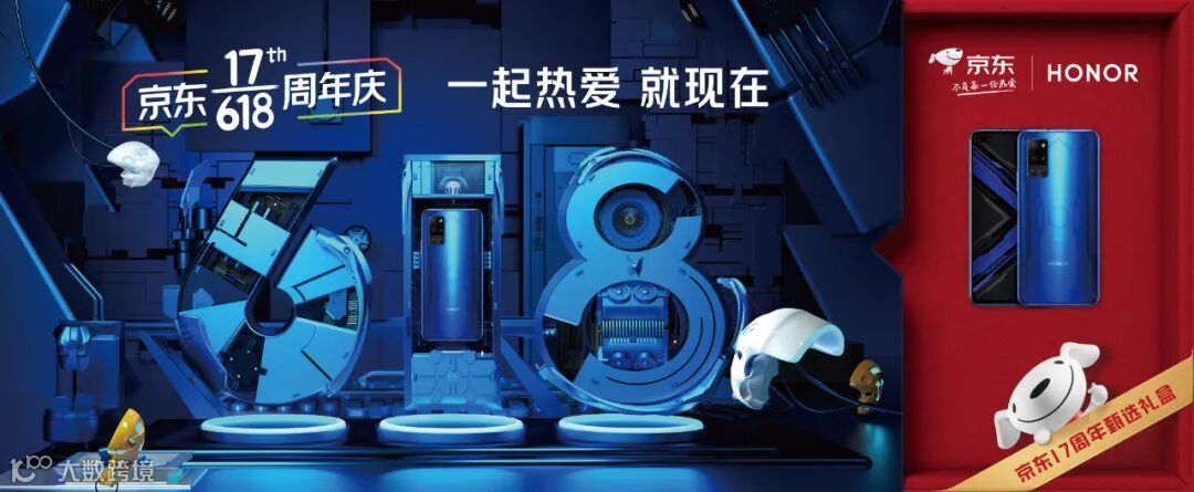 下图的形式为把图形符号作为画面的一个背景元素,风格为3D加合成。