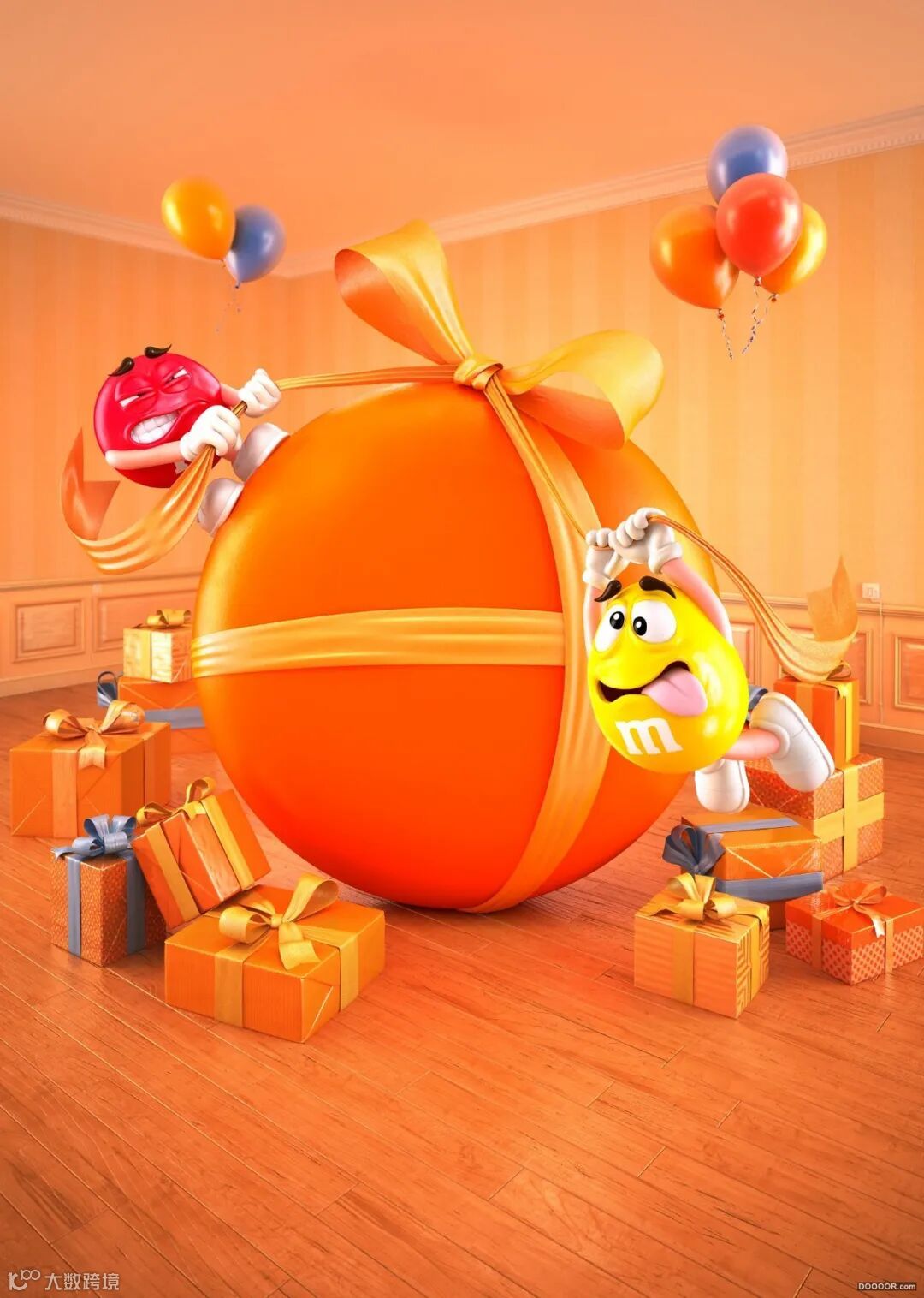 可以是一个IP形象,比如M&M豆豆的各大设计中都会出现他们的公仔: