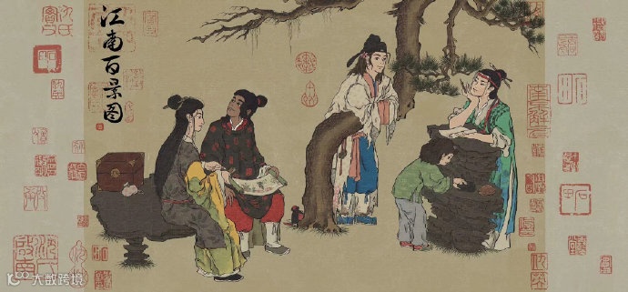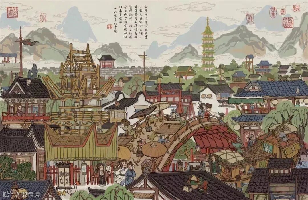 江南百景图的美术采用了古画工笔的形式,立绘精良又富有神韵,场景中的房屋、树木其实对古画进行了有趣的还原,画面中行走的人物、动物变得有些Q版,质朴而灵动,用成语去形容就是憨态可掬。