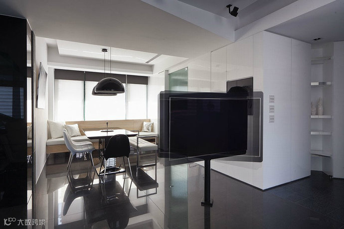 电视墙-设计师在客餐厅间设计可360度旋转地3D超薄LED电视,满足餐厅也需视听享受的要求。