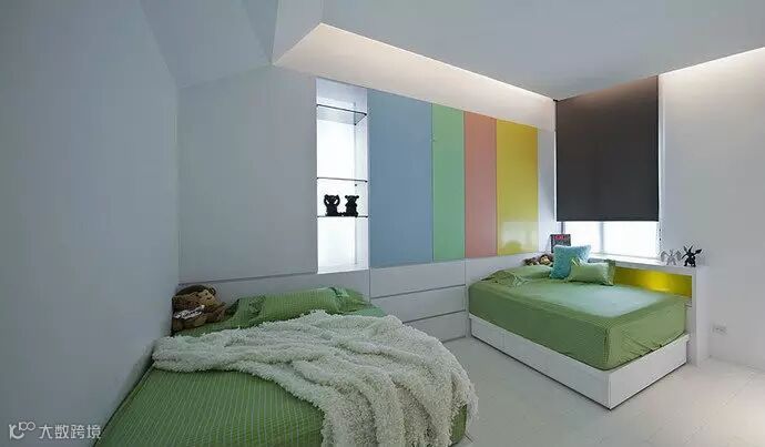 小孩房-为了避免床头压梁的问题,设计师以高难度的三面折角切割出丰富地线条变化。