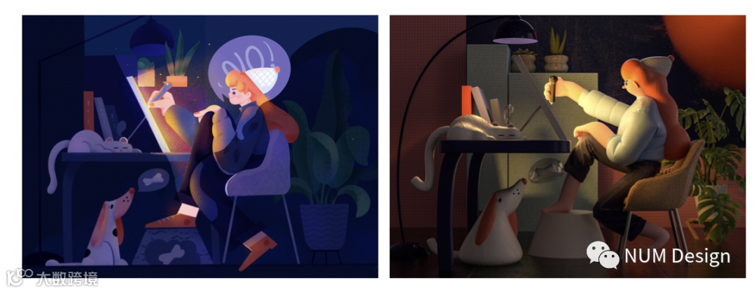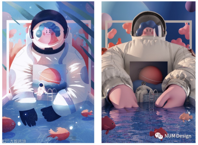 一套不错的复刻作品,将平面作品转为了3D作品。3D作品在色感上更加柔和。但色彩张力却又相对于插画弱了些。整体设计思路和3D作品上的插画感体现是非常不错的。