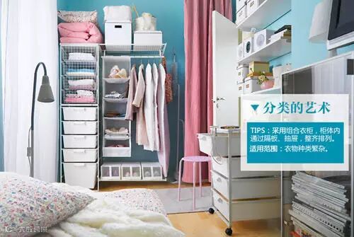 将收纳变成艺术形式还是需要花费一点心思的,或巧妙隐藏,或艺术堆积,或混搭组合,或善用艺术性收纳筐,或艺术悬挂,打破传统,突破常规,衣物就不止在衣柜里,它还可以变成一幅3D画挂在墙上。
