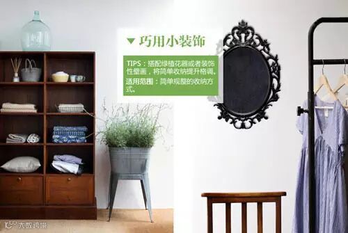 装饰搭配的艺术:单纯的收纳如果难以达到装饰的效果,不妨另外搭配一些装饰性的小物,可以烘托出收纳的美观。日式复古多格衣橱边上加上一个绿植盆栽,清新雅致的效果加倍;简约的衣架旁边搭配同色系的复古艺术镜面,则更添高雅。