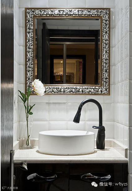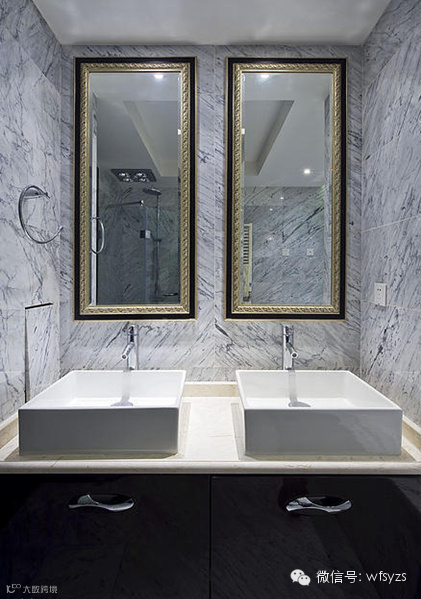 【卫生间装修图片】别墅设计师在卫生间的设计上十分的人性化,双面镜的设置让业主更加的方便,提高了实用性,更有纹路雅致的大理石前来助阵,让设计变得时尚起来。
