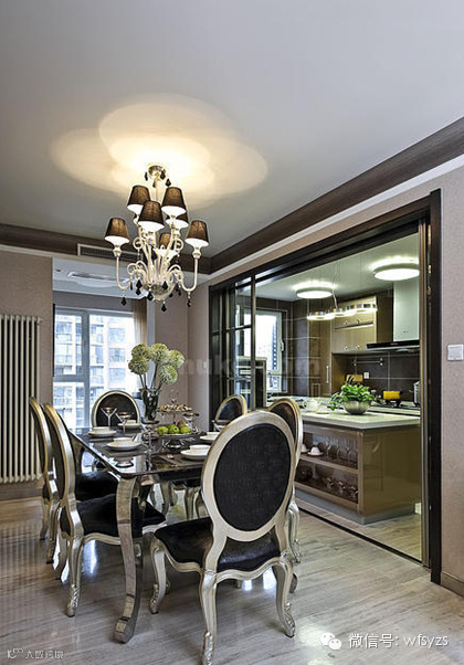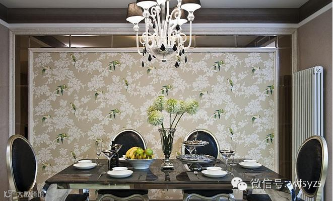 【餐厅装修图片】欧式设计的线条穿插其中,精美的吊灯,复古的墙纸,富有创意的家具皆体现了设计师的用心,在小空间里,赋予更加舒适的身心享受。