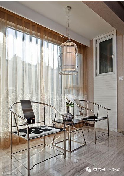 【走道装修图片】简约时尚的家具选用充满了创意,更有鸟笼状的吊灯来调配空间比例,一点点中式元素的运用,更容易得到业主的好感。