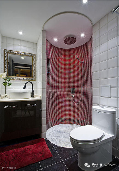 【卫生间装修图片】别墅设计师巧妙的选用了撞色的装修模式,采用红色与白色相互拼接的格局,让卫生间的设计更加的推陈出新,雅致大方。