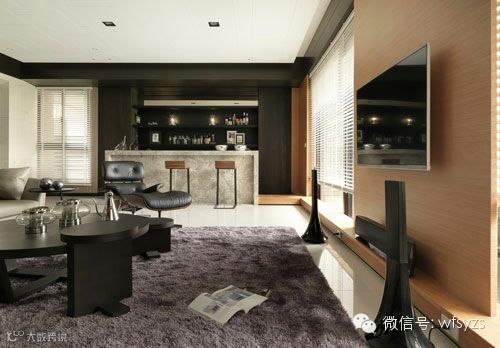 编辑点评:将客厅电视墙改置于长形窗景前,搭配可变换情境的电动百叶窗调节光源。