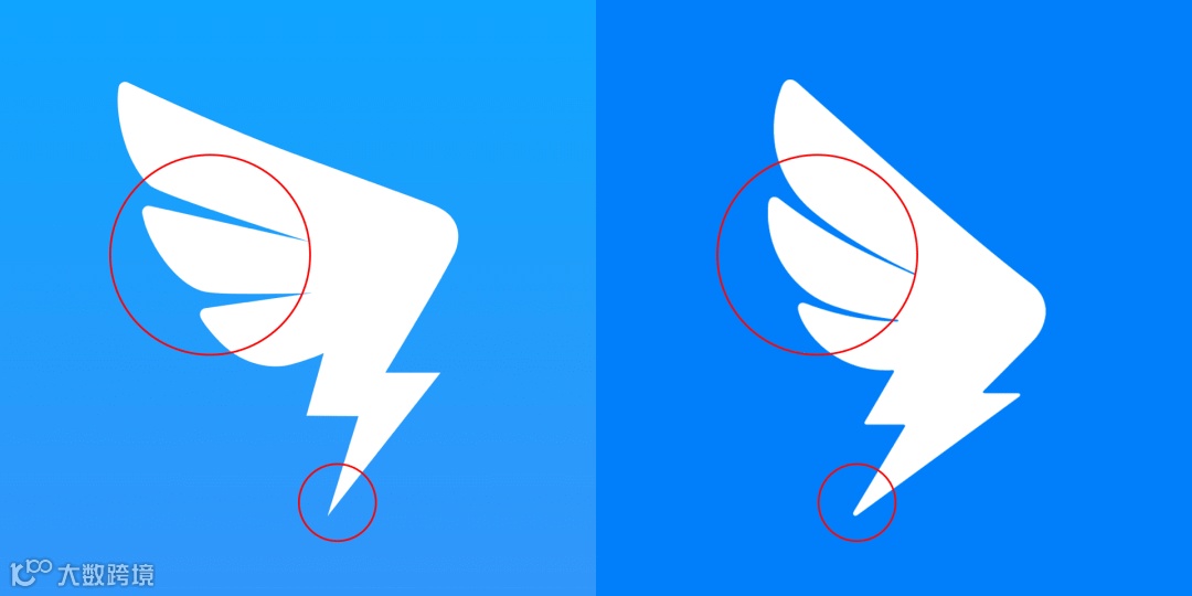 这次logo更新,钉钉稍微调整了图案的角度,让视觉中心从闪电挪到了翅膀上,并且把羽毛的形状调得更圆润了一点。
