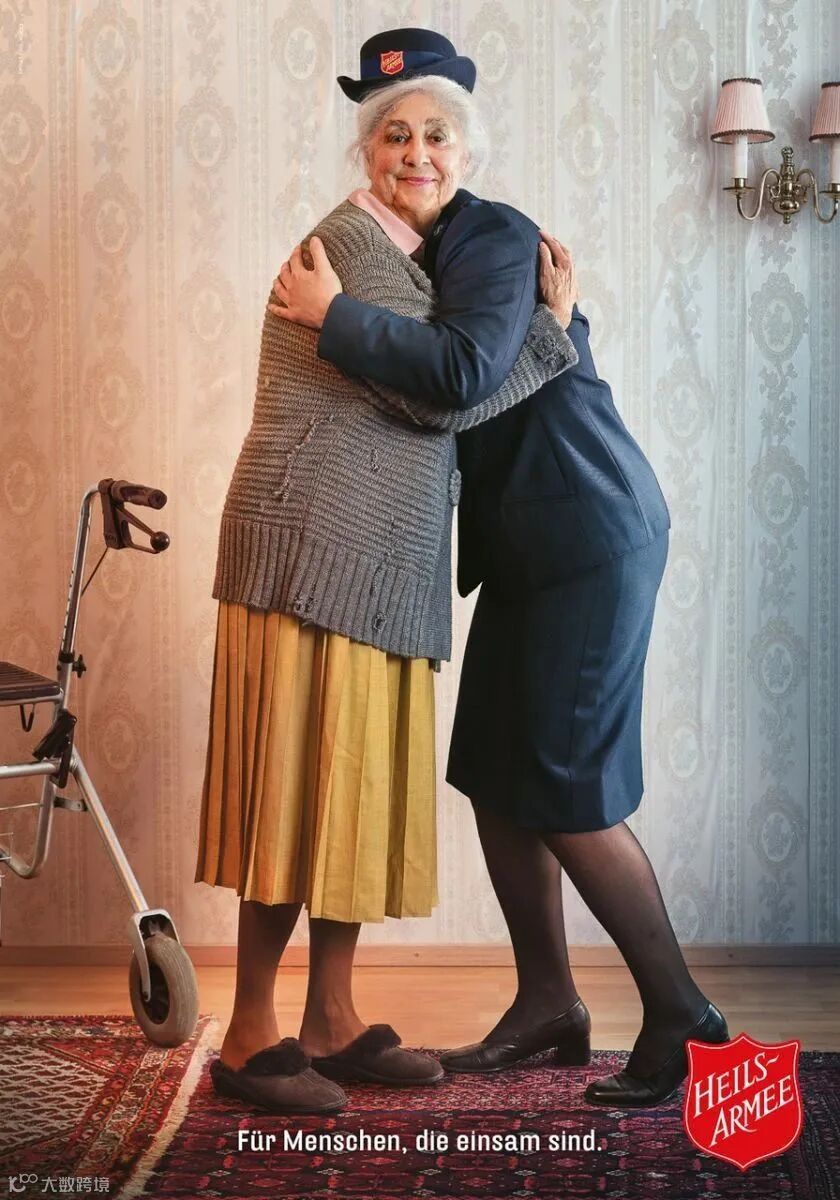 ,图片中两人“共享”一张脸,目的是为了体现救世军和它所帮助的人之间的密切关系。