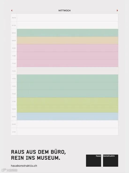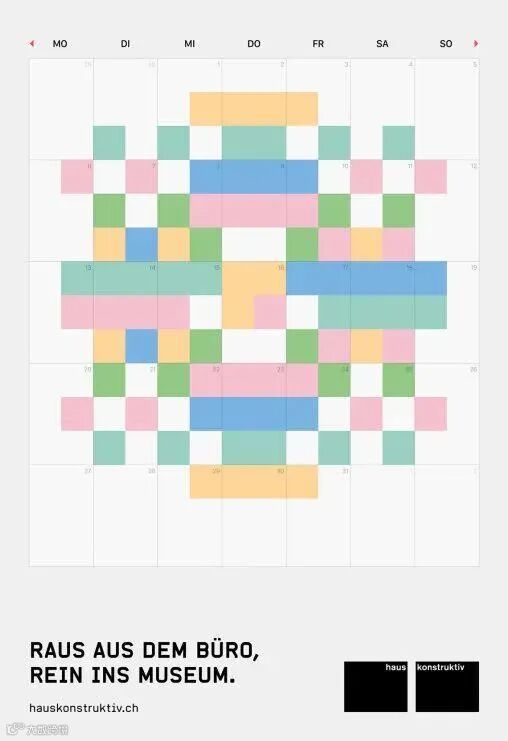 因为博物馆地处苏黎世市中心,距离商业区与人流汇聚地仅仅几分钟的步行距离,因此,他们以电子日程本为灵感,提醒大家:休息一下,走几步路来博物馆欣赏艺术。