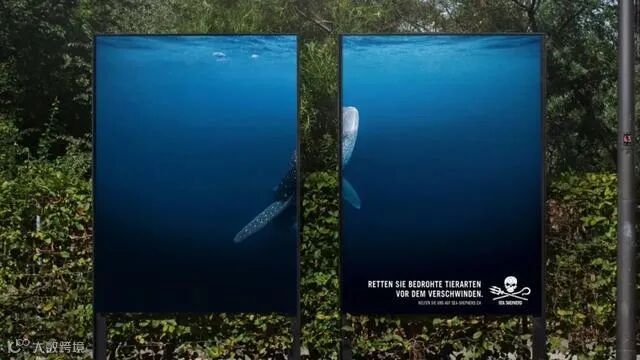 利用媒体排版特性,将海洋动物从中间一分为二,让观众直接感受到海洋动物的悲惨处境。所有的动物都没有面部,象征着它们并没得到人们的重视。
