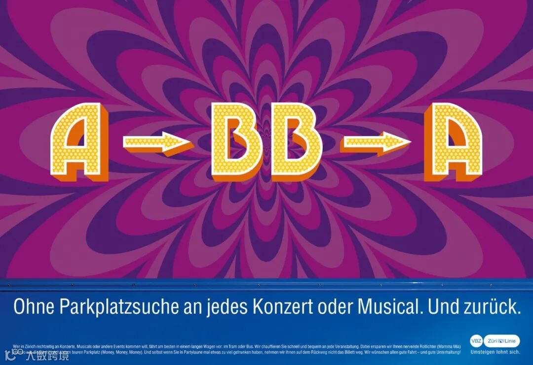 苏黎世公共交通方便人们参加音乐会、音乐剧和其他活动。这张海报通过新颖地使用文本来传达这一点:从A到B,再回来。