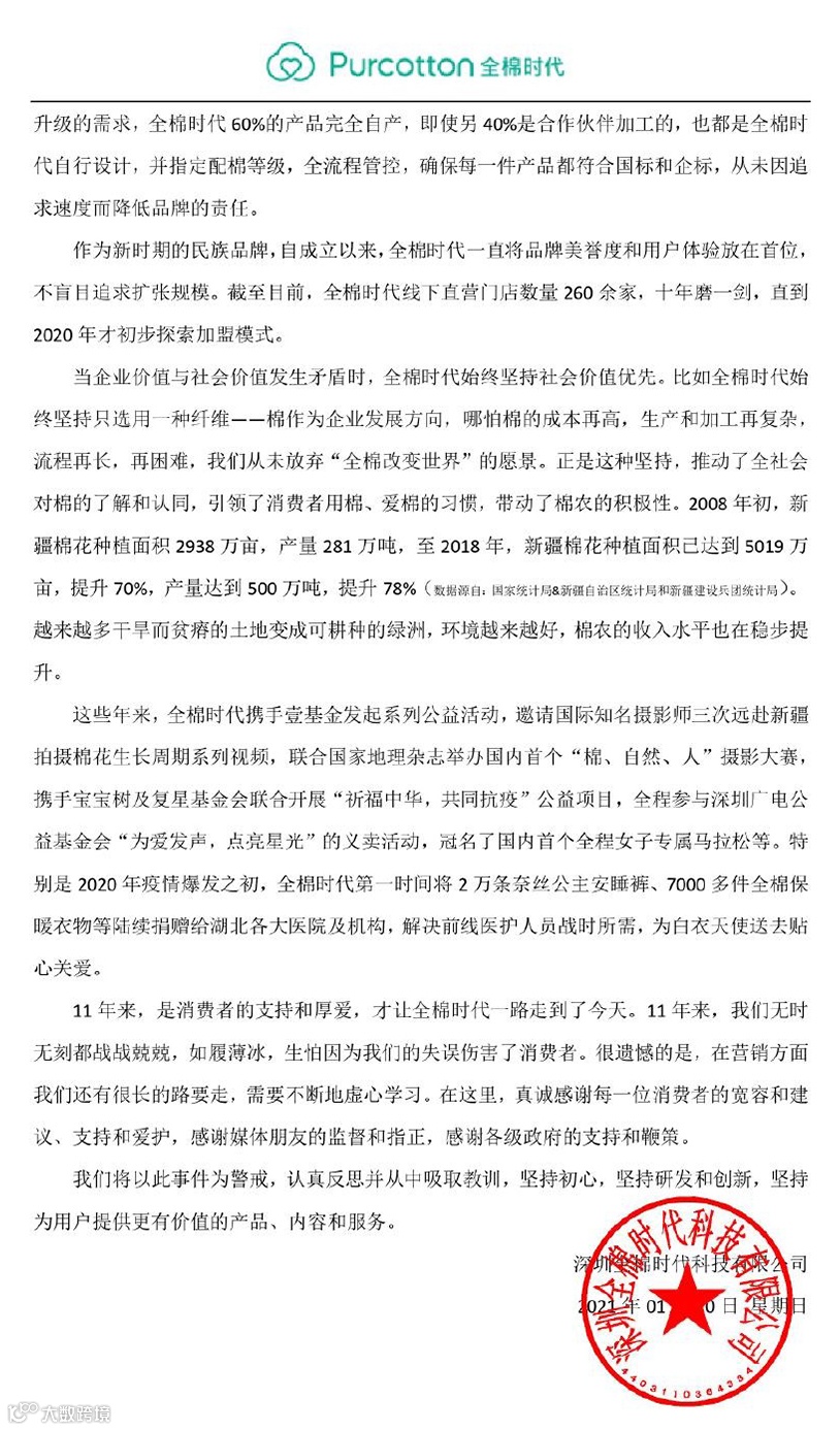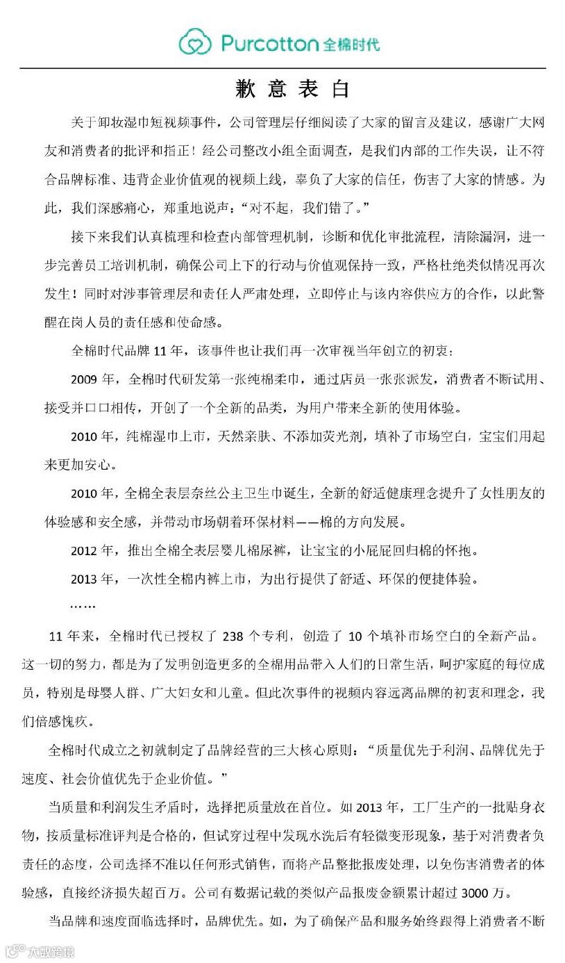 更牛的是,全棉时代最后的公开道歉再现奇葩操作,从诚恳道歉谈到公司发展史,前言不搭后语思路清奇,危机公关却成了品牌表彰大会,不走心的操作再次引发网友抨击。